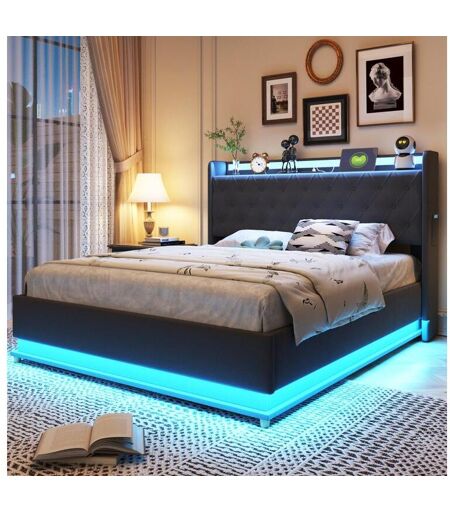 Merax Cama de armazenamento 140 x 200 cm com cabeceira - LEDs e USB - Tecido de linho - Base de ripas - Cinza