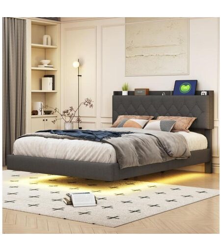Merax Cama estofada 140 x 200 cm com cabeceira - Tomada USB e LEDs - Tecido de linho - Cinza (sem colchão)