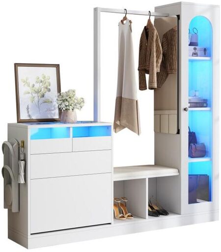 Merax Guarda-roupa 6 em 1 - 163 x 35 x 161 cm - espelho + banco e sapateira + vitrina + LEDs - aglomerado - branco