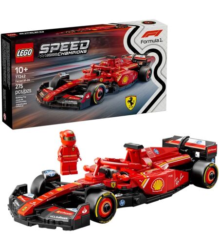 Descrição Rapazes e raparigas 10+ vão desfrutar da emoção da Fórmula 1® com o incrível LEGO® Speed Champions Carro de Corrida Ferrari SF-24 F1® (77242) com piloto. O Ferrari inclui detalhes do carro real que competiu na temporada de 2024 da Fórmula 1, sendoque as crianças e adultos colecionadores de carros vão poder construí-lo, expô-lo e correr com ele. O carro de F1 inclui um cockpit que abre levantando o halo, uma asa traseira, suspensão triangular, autocolantes de patrocinadores e pneus traseiros mai s largos com estampado «Pirelli». O carro de F1 também inclui uma minifigura de piloto com fato da Ferrari e capacete para colocar no cockpit e competir em corridas. Os sets LEGO Speed Champions permitem que os fãs de corridas construam modelos dos mais icónicos veículos do mundo, incluindo outros carros de F1 (vendidos separadamente) da temporada 2024. Cada veículo pode ser criado com as instruções de construção ou com a app LEGO Builder, orientando-o numa aventura de construção agradável. Características Tipo de produto: Jogo de montagem Cor do produto: Multicor Idade recomendada (mín.): 10 ano(s) Número de peças: 275 unidade(s) Material: Plástico Género sugerido: Menino/Menina Idade recomendada (máx.): 99 ano(s) Aviso de segurança Aviso TSD da UE: Nenhum aviso aplicável, Não adequada para crianças com menos de 36 meses Recomendação etária EU TSD: Não adequado para idades inferiores a 18 meses Aviso de risco de asfixia: Peças pequenas Gestão de energia Necessita de pilhas: ✗ ...