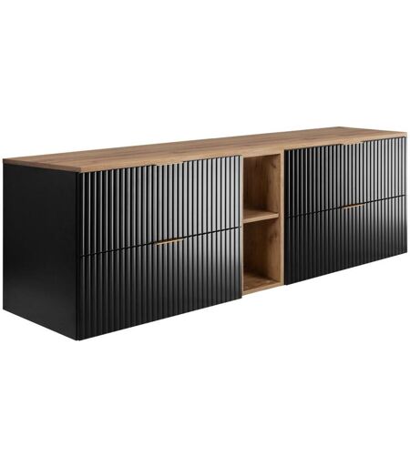 Armário de casa de banho ranhurado FLOW 180 cm preto com estante e tampo carvalho dourado