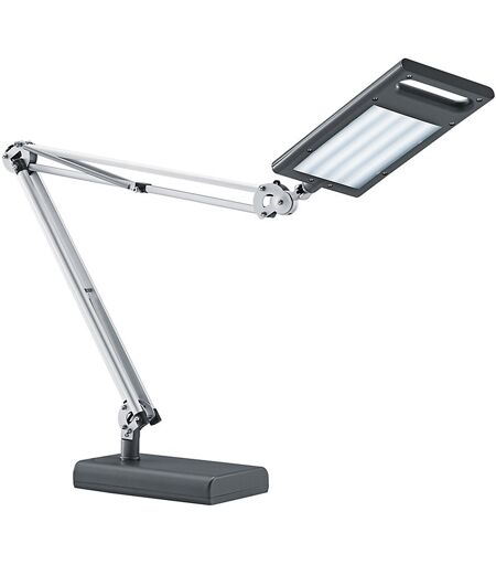 Candeeiro de secretária LED 4 WORK, altura 720 mm, antracite. Fornecimento = montado. Tipo de produto = candeeiros de mesa, candeeiros de LED. Pé do candeeiro = pé de aperto, pé de apoio. Classe de eficiência energética = D (espectro A a G). Consumo de energia = 10 kWh/1000h. Lâmpada = LED. Potência = 9.5 watt. Cor da luz = branco luz do dia. Temperatura da cor = 6000 K. Potência de iluminação máx. = 1000 lux. Corrente para iluminação = 750 Lúmen. Tensão de conexão = 100 - 240 V. Cabo de conexão = 1.8 m. Vida útil = 25000 horas. Cor = antracite. Cabeça do candeeiro = rotativo, inclinável. Comutação = sensor tátil. Material = plástico ABS, alumínio. Altura = 720 mm. Comprimento do braço = 360x360 mm. Candeeiro para posto de trabalho LED de grande qualidade. Grande alcance graças ao braço duplo em alumínio. Com interruptor tátil na cabeça. Filtro de dispersão para uma luz uniforme. Inclui pé e mola. O candeeiro LED 4 WORK de grande qualidade, em alumínio e ABS, pode ser aproximado como desejar e a respetiva cabeça estendida em todas as direções. O braço duplo em alumínio permite chegar ao candeeiro também nos cantos mais recônditos. Com o seu filtro de dispersão especial, este candeeiro ilumina a escuridão de forma uniforme e potente. Um interruptor tátil na cabeça do candeeiro confere-lhe energia e, ao mesmo tempo, tranquilidade. O âmbito de fornecimento inclui a mola e a base. Alcance da mola: 5 - 45 mm, comprimento do cabo: 1,8 m. Interruptor de ligar/desligar na cabeça do candeeiro. Possibilidade de substituição A lâmpada não pode ser substituída. A estrutura do candeeiro não permite que a lâmpada seja substituída, uma vez que existe o risco de danificar a lâmpada durante o processo. ...